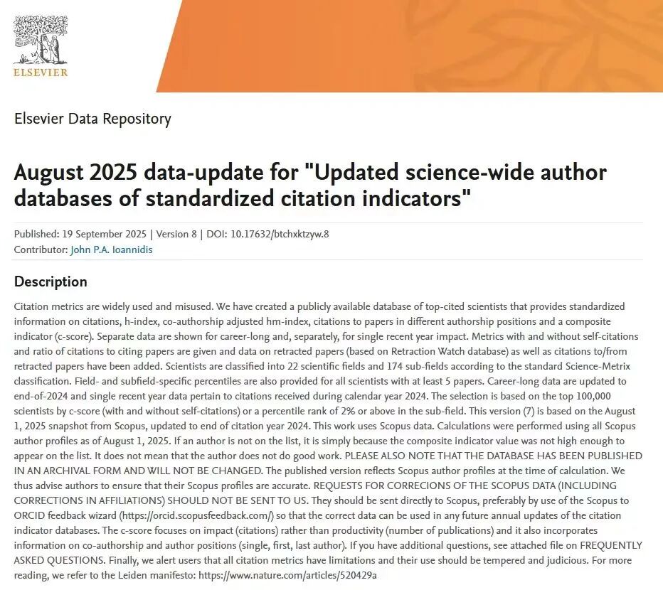 近日,斯坦福大学与国际学术出版社爱思唯尔(Elsevier)联合发布“2025年度全球前2%顶尖科学家榜单”(World's Top 2% Scientists)。该榜单基于Scopus数据库,通过综合评估其论文被引频次、h指数、hm指数(合著修正)、单独作者或第一作者引用数等多维指标,从全球近700万名科学家中,遴选出各学科领域具有突出影响力的顶尖学者。榜单涵盖自然科学、工程技术、医学等22个主学科领域及其下属174个子领域,分为“终身科学影响力排行榜”(Career-long impact)和“年度科学影响力排行榜”(Single-year impact)两大类。
