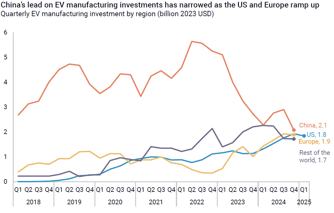 Rhodium Group通过“清洁投资监测器”追踪了全球1,248个电动车与电池制造项目。美国在过去四个季度内累计清洁能源相关投资达2,790亿美元,同比增长6%;与此同时,中国仍在全球电动车、电池和制造端保持规模优势,是全球清洁产业链中最具系统性的供给方之一。