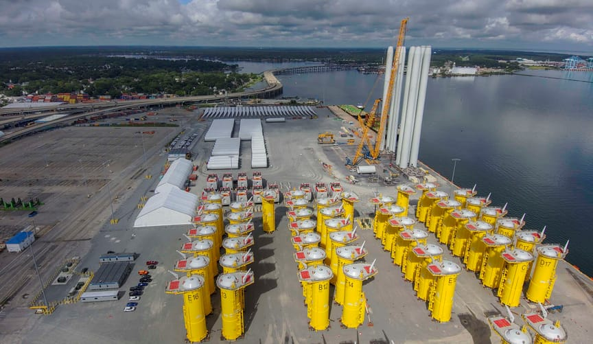 施工进展迅速:截至9月底,项目已完成全部176台风机的基础安装,成为美国首个进入最终装机阶段的超大型海上风电项目。良好的气候条件及大西洋平稳的飓风季使施工进度显著加快。若未在10月底前完成基础打桩,施工将被迫延期至次年春季——这一关键窗口受限于保护北大西洋露脊鲸的联邦许可要求。